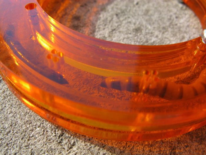 "There are air-holes so they can remain living while you wear them! Jorge and I designed the bangle for some mealworms we procured at Petco. They like dry oatmeal or some hunks of potato."