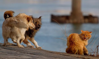 This cat is every brave at first in the face of a few dogs. Then it simply runs away. This proves the old adage that if you run away you’ll live to fight another day.